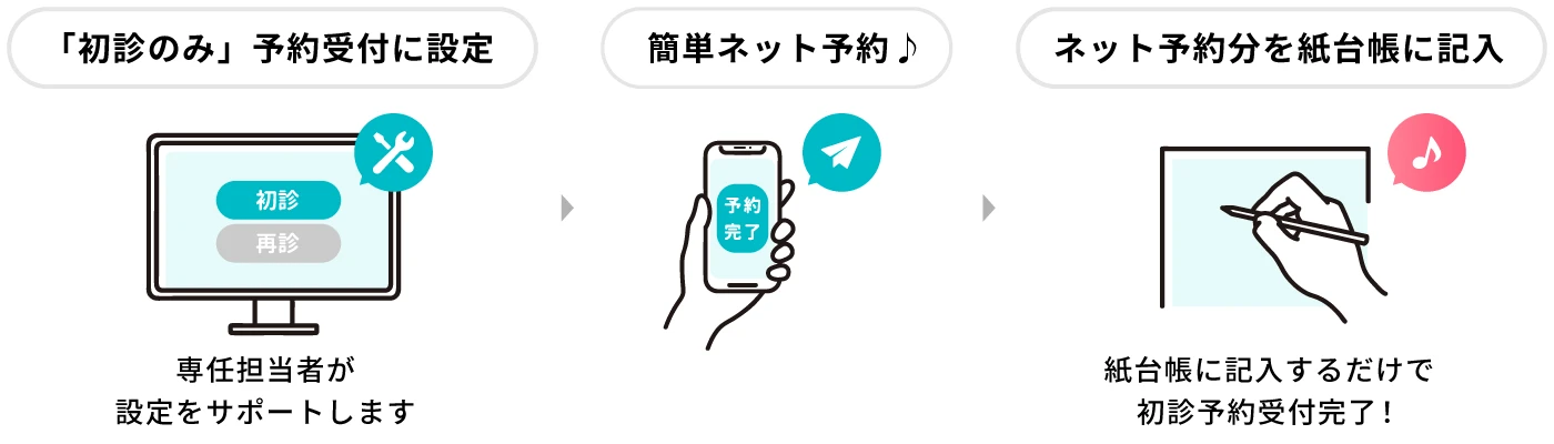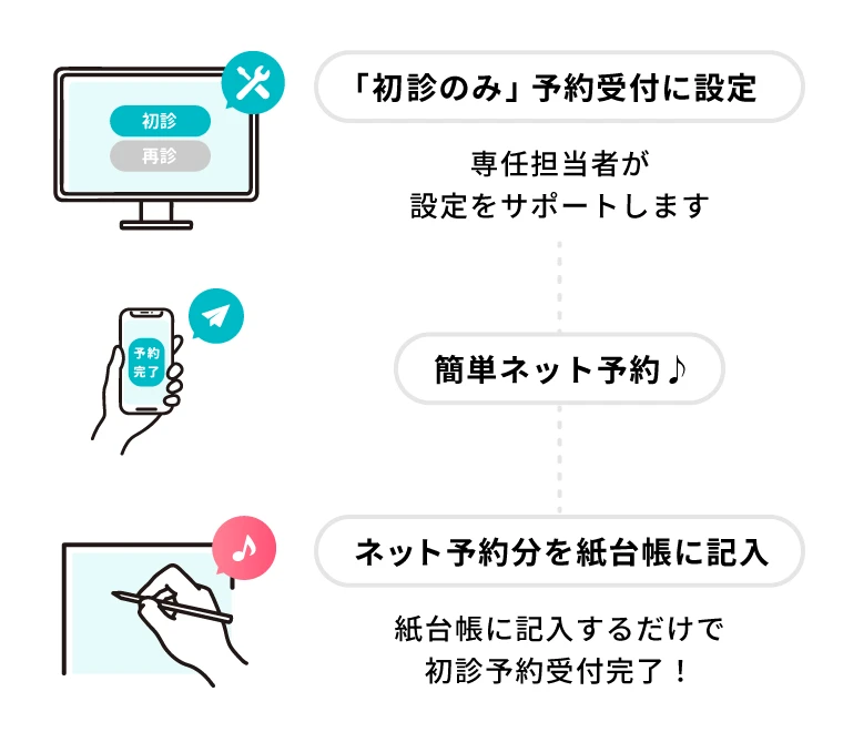 アポクルでは、「初診のみ」「再診のみ」など科目ごとに受付可能枠を設定できます。アポクルでの予約分を台帳に記入するだけなので、これまでのフローをあまり変えることなく、お気軽にネット予約を導入できます。初診以外の予約は従来通り紙台帳で管理いただけます。