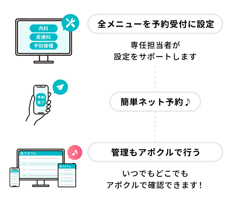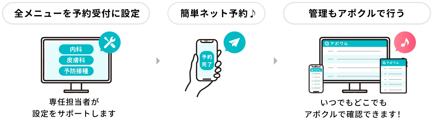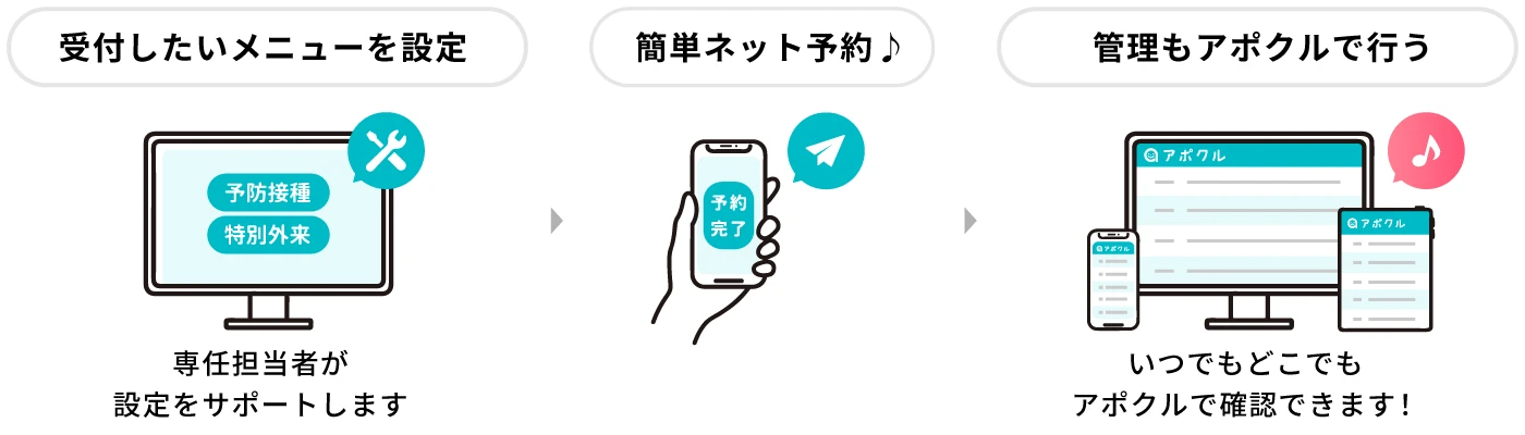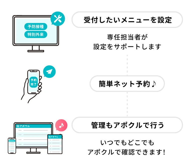 アポクルでは、「予防接種」「特別外来」など科目ごとに個別のメニューを設定できます。ネット予約分のみアポクルで管理することも、全ての予約をアポクルで管理することも可能です。お好きなメニューのみをネット予約で受付することにより、無理なく予約システムを始められます。